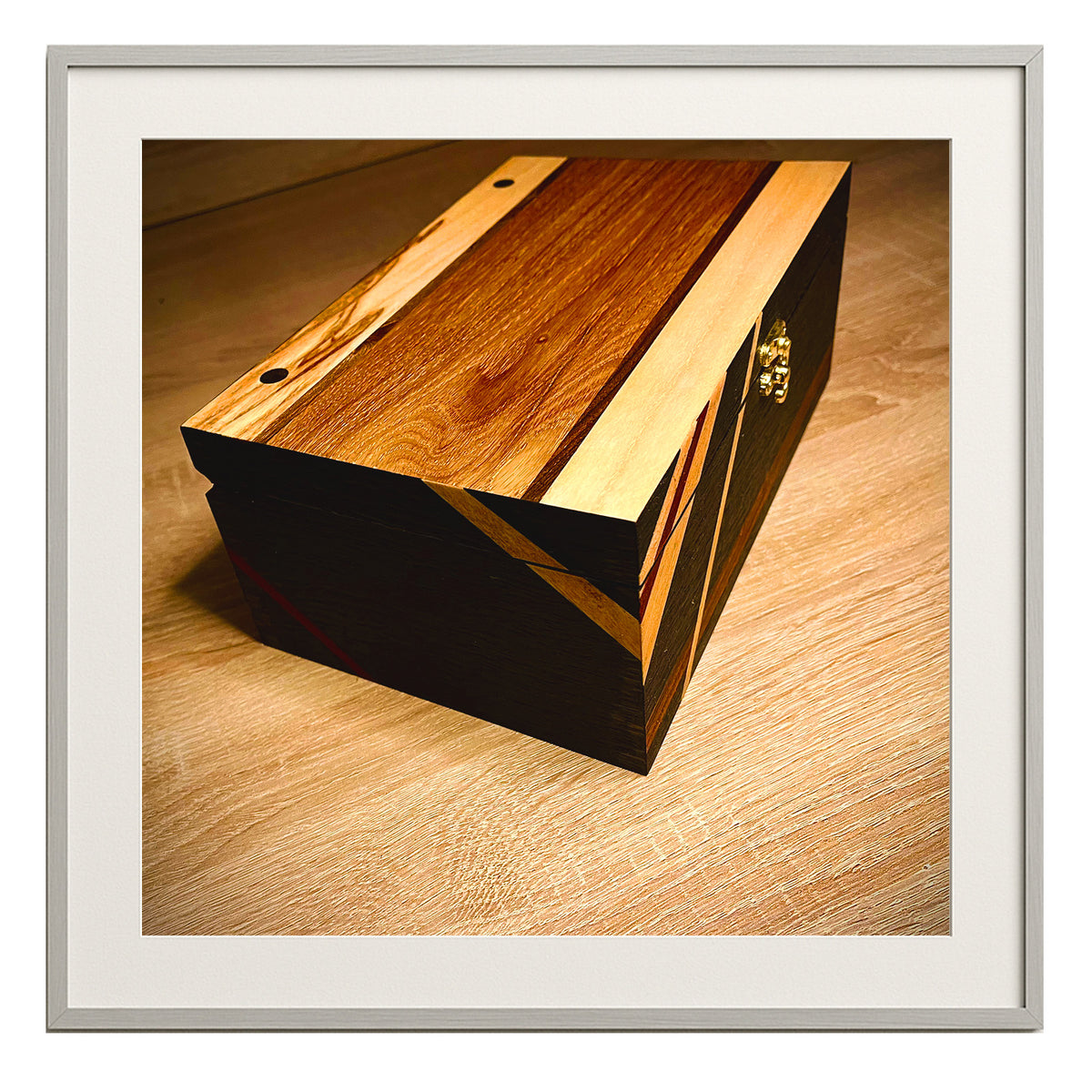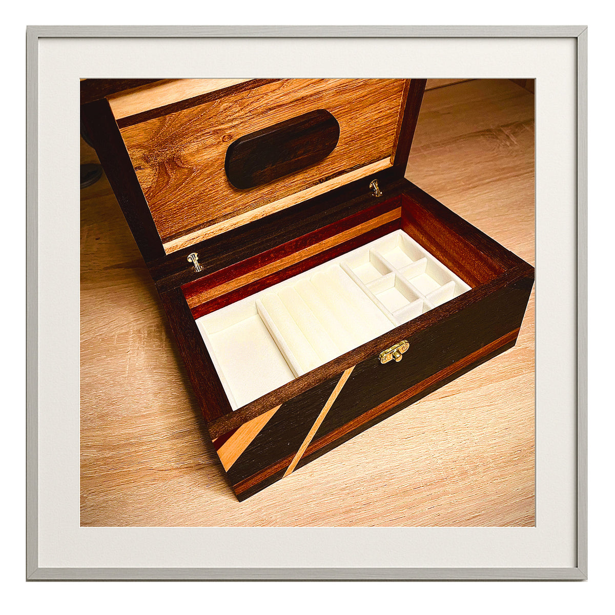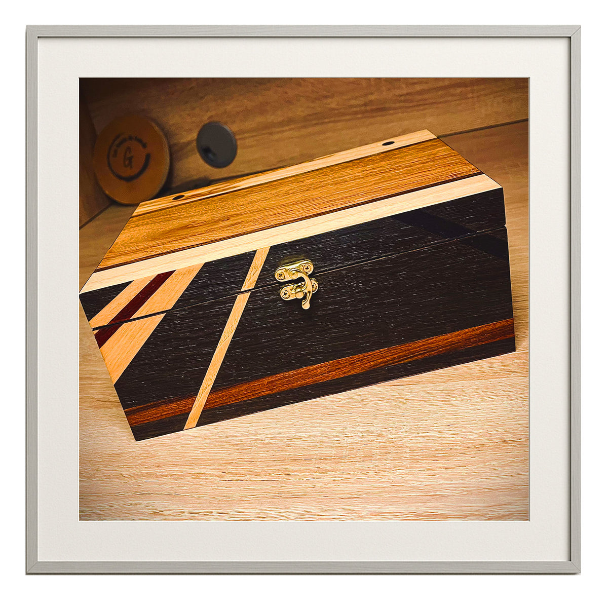 C'est une pièce rare. Conçu pour une grande dame, il marie l’élégance du chêne des marais à la puissance colorée du padouk. Son dessin géométrique, précis et équilibré, évoque la rigueur et la grâce à la fois. Chaque angle, chaque contraste a été pensé pour souligner la noblesse du bois et la modernité du motif. À la croisée de l’art décoratif et du savoir-faire d’ébénisterie, ce coffret incarne l’idée même d’un hommage : celui rendu à une femme remarquable.